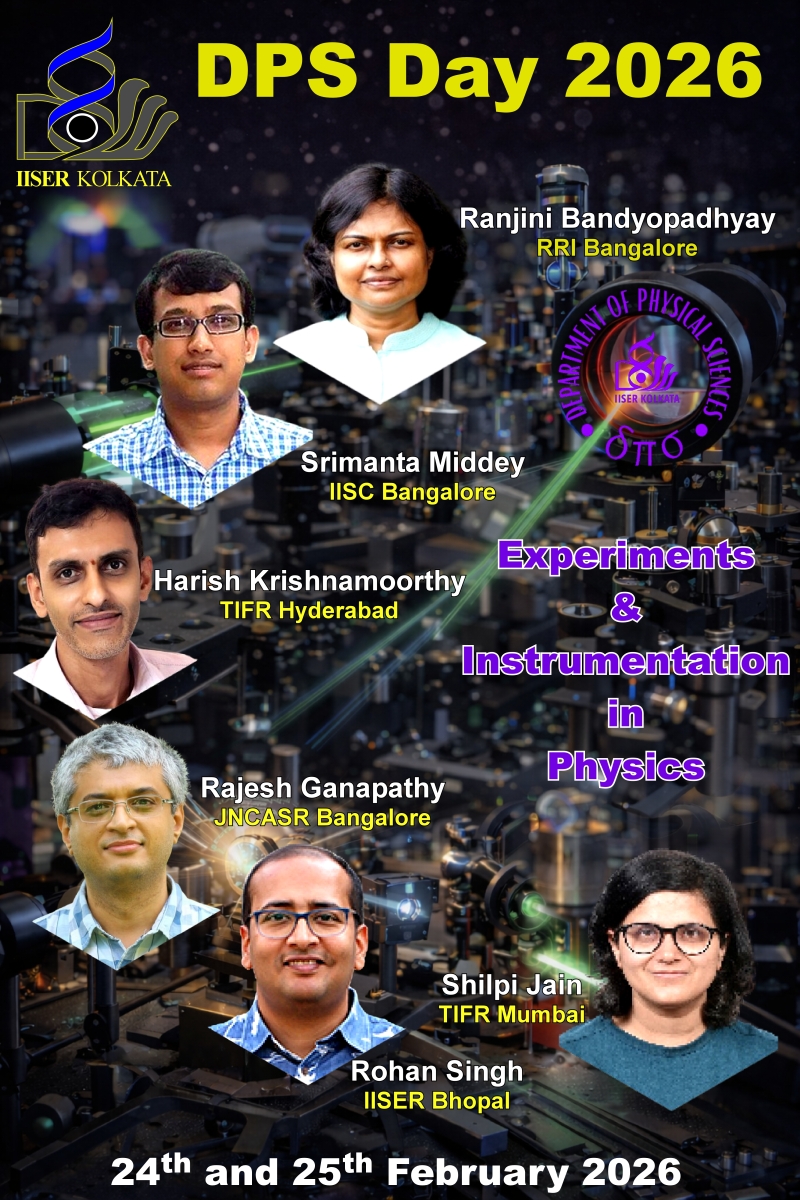 On behalf of the Department of Physical Sciences (DPS), it is our pleasure to cordially invite you to the DPS Day 2026, to be held on 24th and 25th February 2026 at the M. N. Saha Auditorium (TRC Ground Floor), IISER Kolkata.